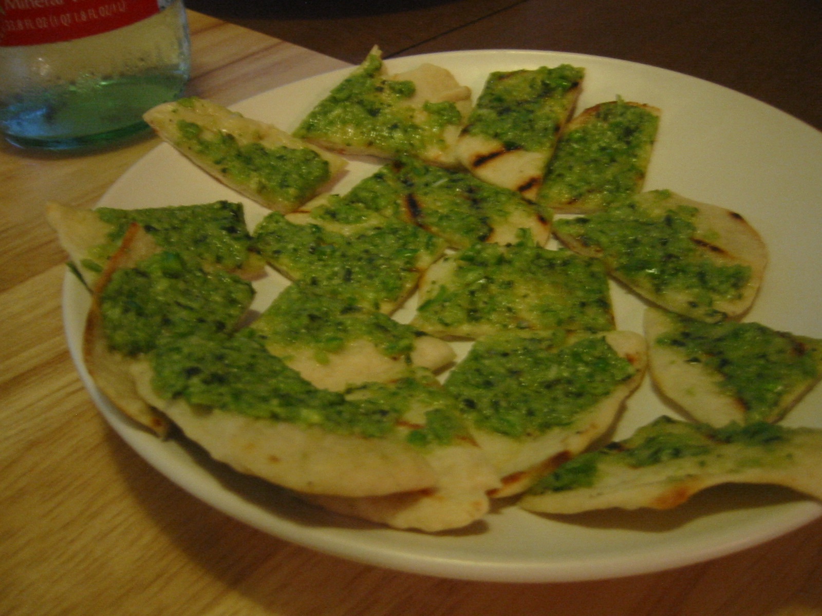 We started out with scape pesto on flatbread. Scapes, which are the stalk part of a garlic bulb, are all over the place. They're only available for about a month in the early summer season. Pesto seemed like the best bet. Most scape pesto recipes advise a strait scape, oil, parmesan and nut mixture, but we through in a ton of basil because garlic scapes are strong. Even with basil I still tasted garlic for the next 24 hours.