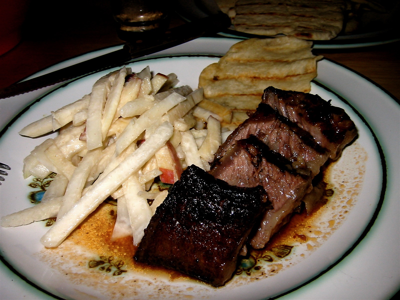 The marinade consisted of freshly brewed coffee, honey, tomato paste and oregano (also from the CSA). Just dipping a finger in and I knew we had a winner. After browning the meat and deglazing with the marinade, we topped up the pot with beef stock, some chipotle peppers with adobo, then cooked it slow and low for a few hours. The combination of earthy coffee, rich beef flavor and a spicy tomato kick worked awesome. Each bite of the short rib was unbelievably juicy because of all the marbling throughout the meat (see above).
