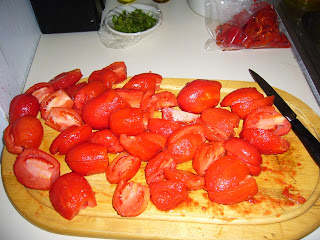 On Sunday I started out to can whole tomatoes. Since we don't have a dishwasher to sterilize the jars, I boiled the jars and lids, and then blanched the tomatoes in order to remove their skin. After filling up the sterile jars with peeled and quartered tomatoes, I added a tablespoon or so of lemon juice to each. This prevents botulism, which is some pretty nasty stuff. Peeling tomatoes was probably the most painstaking part, but really not as hard as I expected. There's a simple technique for peeling tomatoes, or any skinned fruit or veggie. Bring a pot of water to a boil, throw the tomatoes in for a few minutes, then remove them and dump 'em in an ice bath. The skins just slide right off. Messy, but simple.